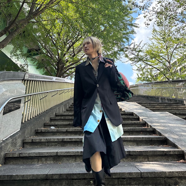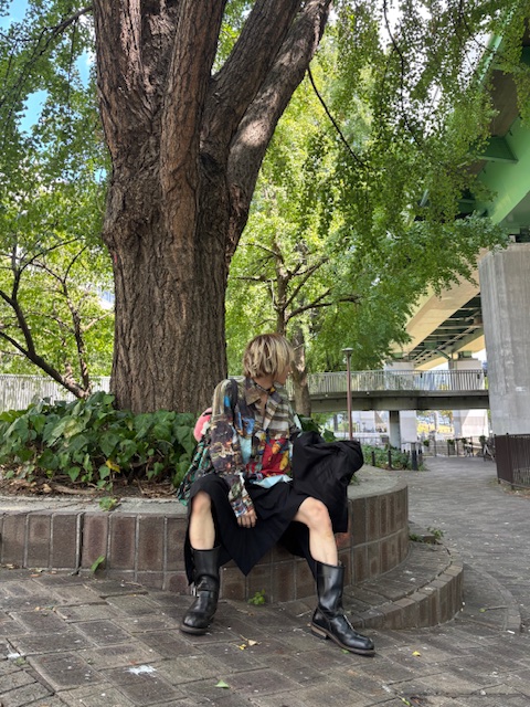 スカートは女性が履くものというふんわりやんわりとした社会の常識へのアンチテーゼとしてスカートを主軸にパンクにスタイルを組みました。