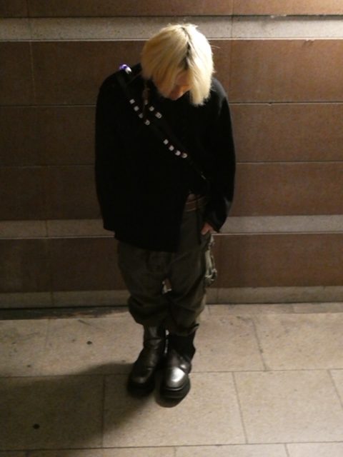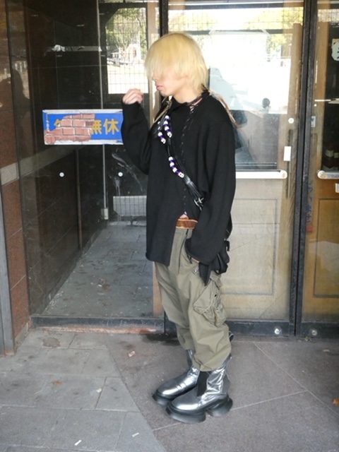 ポイントとしては、LGB特有のサルエルパンツのシルエットに対して、いかにレースアップが際立つヨウジのニットを合わせるかと考え試してみました。今回使用しているのは、私の私物のブーツですが、このようにブーツインをして、サルエルの良さを残しつつカーゴのデザインを目立たたせることでコーデが一気に引き締まりました。